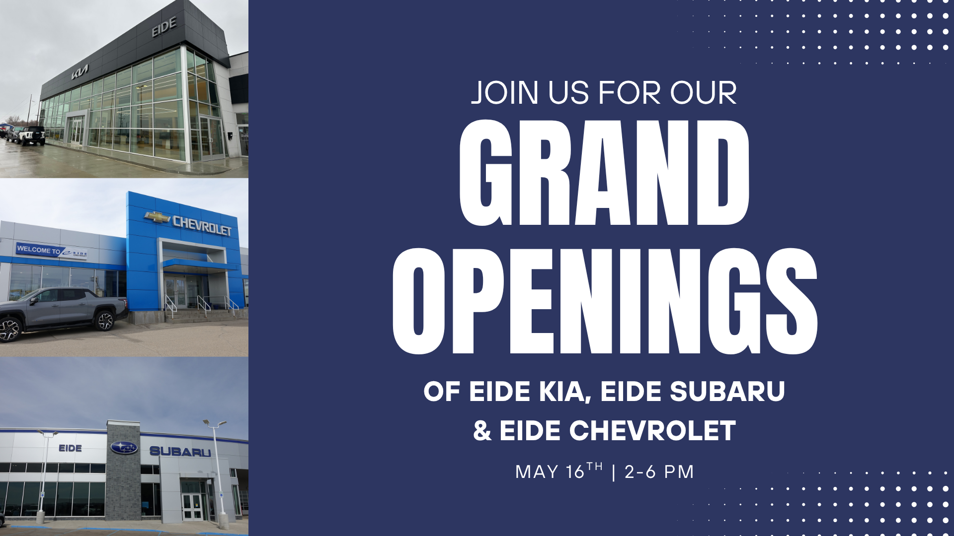 Please join us for the Grand Openings of Eide Kia, Eide Chevrolet, and Eide Subaru!  We welcomed Eide Subaru and Eide Chevrolet to the Eide Automotive Group in December 2024, and are excited to...